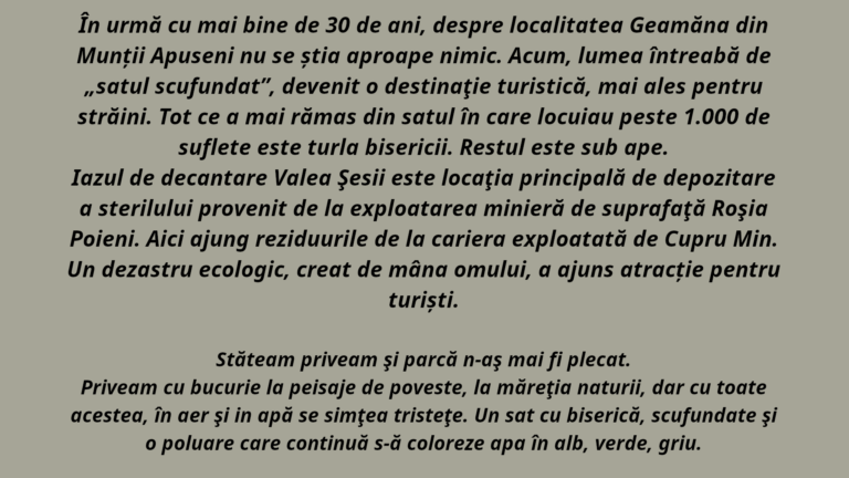 Lungime traseu 65 km , Durată traseu 7 h 20 min, Timp mişcare 5 h 10 . Viteză medie 12,2 km/h . Interval altitudine 474 – 1238 m. . 14 Roşia Montană - Biserica Scufundată GPX meteo Cele mai frumoase momente sunt lângă tine, ai nevoie de puţin timp să le priveşti.